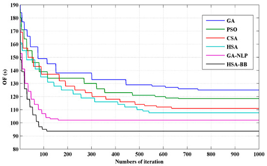 Table 11 shows the results obtained by implementing all the methods for the IEEE 30-bus system. It comprises the OF values, numbers of violated coordination constraints, required numbers of iteration, and convergence time. The given OF value by HSA-BB, shown in Table 11, is the minimum compared to all other methods. It is also experienced that during the simulations of this complex system, sometimes hybrid GA-NLP does not converge even at a feasible solution and stops prematurely. Also, a violation of coordination constraints has been observed in GA, PSO, CSA, HSA, and GA-NLP, whereas there is no violation observed in the results of the proposed methods. The convergence of all algorithms is graphically illustrated in Figure 6. As seen in Table 11 and Figure 6, the numbers of iteration and convergence time are also lowest in the HSA-BB method as compared to GA, PSO, CSA, HSA, and GA-NLP methods. The simulation results confirm that HSA-BB gives better results compared to the remaining methods. However, the proposed HSA-BB algorithm has more parameters to be tuned as compared to the other methods. The tuning of the parameters is indeed a time consuming and tedious task. Also, the harmony memory size is bigger than the initially generated nest of the cuckoo search method. Therefore, it requires more memory to store the solutions.