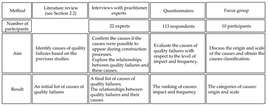 This research is intended to identify the causes of quality failures and study the importance of the causes (impact and frequency), origin, and scale. First, a comprehensive literature review was conducted to establish a foundation (see Section 2.2). Second, experts’ interviews supported and validated the findings from the literature review. Third, the final causes based on the experts’ interviews were prioritized to be further analyzed by a questionnaire survey. Finally, a focus group was carried out to evaluate the efforts required to address these causes (Figure 2).