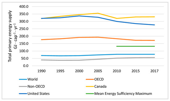 To put these figures in context, based on data from the International Energy Agency <www.iea.org>, the world TPES was about 78 GJ per capita in 2017, ranging from an average of less than 56 GJ per capita for nations not included in the Organisation for Economic Co-operation and Development (OECD), to about 172 GJ per capita for OECD nations. Among the highest levels of energy use were the TPES in Canada, at 338 GJ per capita, and the TPES in the United States, at 284 GJ per capita, in 2018 (Figure 2). Meanwhile, measures of well-being vary considerably, for example, high levels of average life satisfaction (2010–2018) are found in nations using more moderate levels of energy use such as Mexico, Colombia, and Costa Rica, with the USA ranking 31st in life satisfaction [60] and 44th in LEB (2018) [61]. In finding a mean energy sufficiency value of 132 GJ ∙ cap−1 ∙ yr−1, this review suggests that while previous targets and estimates may be toward the low end of energy sufficiency values (i.e., energy sufficiency minimums), there exists ample opportunity for reducing the highest levels of energy use while supporting a high quality of life. Such reductions would support a just transition by reducing the inevitable harms associated with energy use while enabling greater equity in levels and modes of energy use.