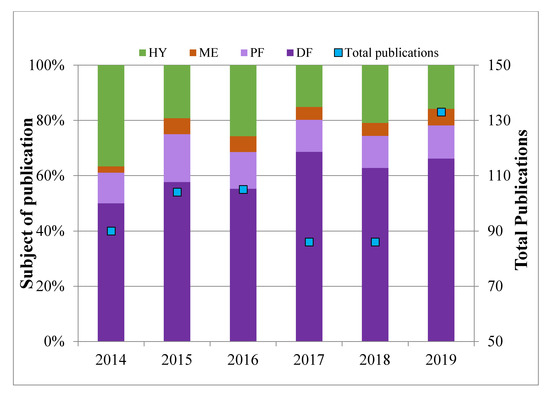 Summary of publications from Scopus in regard to BioH2 production from biomass via dark fermentation (DF), photo fermentation (PF), microbial electrolysis (ME), and hybrid (HY, combined process including DF, PF, or ME).