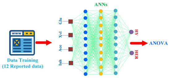 Because of its inherent features of fast converging and less computational time, together with equipped statistical analysis, this hybrid ANNs–RSM technique has presented very appealing application future. In this work, the references from Table 2 (in total 12 data sets) were utilized for data training. Four inputs (Glu, Xyl, Ace, and Inh), two outputs (HY and HER), together with three hidden layers (10 nodes in each layer) were used for the establishment of ANNs shown in Figure 3. Before training in ANNs, all training data were normalized using the maximum reported value from the references. For example, in the column ‘Glucose’ in Table 2, the maximum reported value for glucose is 31 (g·L−1), therefore, this value was used to normalize the entire column. The detailed established ANNs–RSM using BBD design can be found in Supplementary Table S1.