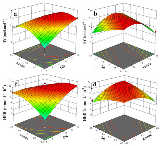Effects of significant binary factors upon HY and HER across different literatures in Table 2, where (a) refers to HY vs the variations of acetate and glucose, (b) refers to HY vs the variations of inh and acetate, (c) refers to HER vs variations of acetate and glucose, (d) refers to HER vs variations of inh and acetate.