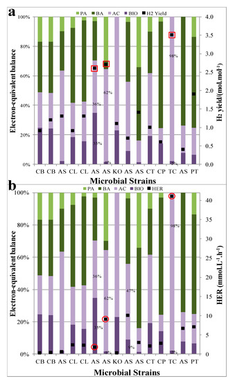 Distributions of electron equivalent balance across literature reports in Table 3, (a) HY vs different microbial strains and (b) HER vs different microbial strains, where horizontal axis refers to the microbes used during cultivation. Note: the electron sinks fractions in the major liquid metabolites were normalized in the electron-equivalent balance. Square refers to HY and circle refers to HER.