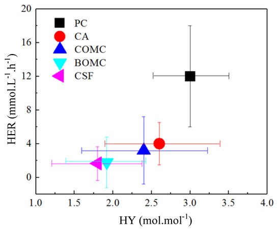 Comparisons of BioH2 performances (HY versus HER) across different categories using biomass, where PC refers to pure culture, CA refers to chemical addition, COMC refers to continuous operation with mixed culture, BOMC refers to batch operation with mixed culture, CSF refers to consolidated saccharification and fermentation.