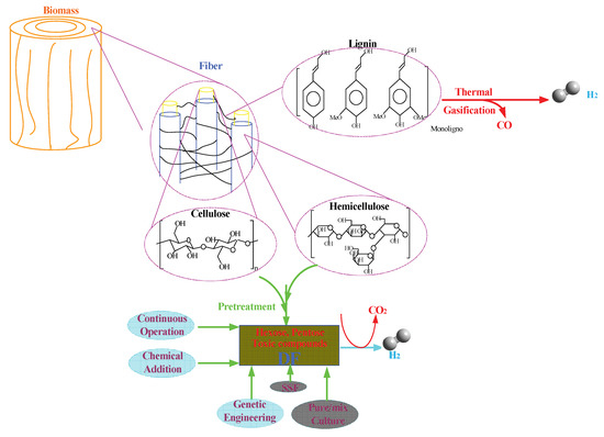 The cost estimation of any developed process can be performed by studying the cost of the different components of the overall process. In the case of biomass pretreatment, these components include the cost of the biomass, equipment (fixing the CAPEX), chemicals, energy consumption, and operational expenses (depreciations, labors, plant overhead, etc.) during the process. The current status quo of economic analysis or cost estimation of biorefinery using lignocellulosic biomass mainly depends on the laboratory scale (some were conducted on pilot scale) experimental data and overall mass balances analysis to roughly estimate the associated CAPEX and OPEX costs [129]. Among the costs for different pretreatment process, the conventional acid hydrolysis are still among the most competitive and widely industrial adopted process for subsequent biorefinery such as ethanol and butanol productions [130]. For example, Kazi FK et al. performed the economic analysis of four different pretreatment processes namely, dilute acid, two-stage dilute acid, ammonia fiber expansion (AFEX), and hot water pretreatment. The result indicates that the highest ethanol yield of 289 (L·t−1) with lowest gasoline cost of 1.36 (US $·L−1) of gasoline equivalent for dilute acid method [131]. According to André et al., total annual cost (TAC) of diluted acid hydrolysis process developed from national renewable energy laboratory (NREL) is still one of most competitive process achieving at 225 M$, while liquid hot water (LHW) and AFEX processes are 328 and 359 M$, respectively [132]. This might be the reasons that the numbers of available reported works focusing on using acid hydrolysis for pretreatment are still quite high. In this work, a potential process for the integrated utilization of biomass combining the conventional mature thermal process with DF to produce BioH2 is proposed and depicted in Figure 8. The selection of biomass compounds for conversion into hydrogen depends heavily on the inherent physical and chemical features of three main compositions (hemicellulose, lignin, and cellulose). Taking lignin (mainly available from industrial black liquor) for example, containing large amount of aromatic compounds (resin like materials with relative higher heating value), it might be an appealing precursor for hydrogen generation via conventional thermal approaches such as gasification and steam reforming [133,134].