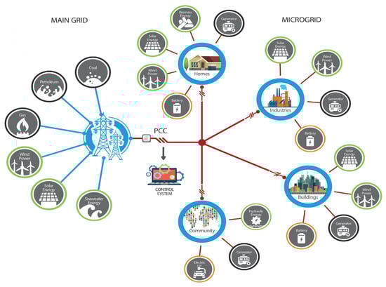 An AC microgrid consists mainly of distributed generators, loads, and energy storage systems connected to an AC bus commonly employed as the point of common coupling (PCC) with the main grid. In contrast, a DC microgrid is commonly designed for a distributed renewable energy source, energy storage systems, and DC loads, connected to the main grid via a bidirectional DC/AC converter for common integration [5,6]. Subsequently, a hybrid architecture includes AC and DC networks with AC and DC loads together with other typical components of a microgrid [4,7,8]. A typical structure of a microgrid with its components is depicted in Figure 1, where the control system works as an interface with the utility grid.