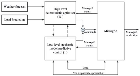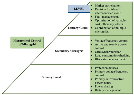 The primary (local) level is related to individual components and local controls (distributed generators, energy storage systems, loads, and power electronics interfaces, meeting voltage and frequency references, islanding detection, power-sharing, and power generation control). The secondary level is in charge of load and renewable energy sources, load shedding/management, unit commitment/dispatch, secondary voltage/frequency control, secondary active/reactive power control, security monitoring, and black start. Finally, the upper or tertiary level is related to the market participation of microgrids, managing decisions for importing or exporting energy where a distribution network operator and a market operator can be found [3,10,11,12,13].