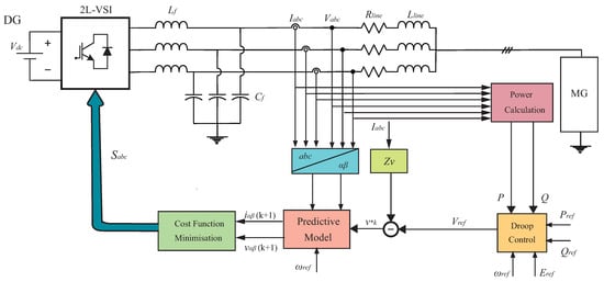 Finally, using the voltage regulation capability from the modified finite control set MPC scheme for controlling the converters expressed as the total cost function from Equation (4), in [12], the author could integrate the VSCs into the AC microgrid environment adding a virtual impedance loop and a direct droop control strategy to generate the voltage references. The proposed FCS-MPC scheme for the VSCs used in the AC microgrid can be seen in Figure 3.