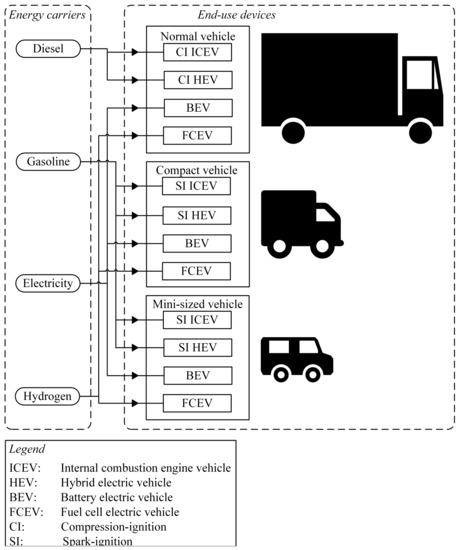 Due to the variety of vocational uses, there is a large number of road freight vehicle types. In Japan, the MLIT reported fuel consumption data for 5272 road freight vehicle types [55], mainly ICEVs. Considering this number of vehicle types in the vehicle stock turnover model is not practical. Therefore, the structure of the road freight vehicle fleet was simplified, assuming there are only 12 vehicle types: ICEVs, HEVs, BEVs, and FCEV, available in three vehicle size classes, normal, compact and mini-sized vehicles. Additionally, based on the analysis of the same data from MLIT, it was assumed that all normal ICEVs use diesel; and all compact and mini-sized ICEVs use gasoline.