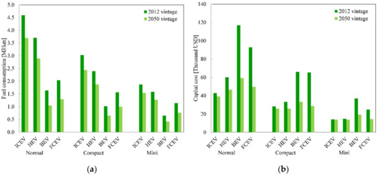 Fuel consumption and capital cost for the road freight vehicles in 2012 and 2050 are shown in Figure 2. Fuel consumption data for ICEVs in all vehicle size classes in 2012 were estimated using data reported by MLIT [56]. Using ICEV fuel consumption as a reference, 2012 fuel consumption for EDVs in the normal size class was estimated assuming the ICEV and EDV fuel consumption ratios are identical to values reported in [35] for HEVs, and in [57] for BEVs and FCEVs. Fuel consumption in 2012 for EDVs in the compact size class and the mini-sized BEV was estimated considering the ICEV and EDV fuel consumption ratios are identical to the values reported for normal LDVs in [53]. Fuel consumption in 2012 for the mini-sized HEV and FCEV was estimated assuming the fuel consumption ratios for ICEV and HEV and for ICEV and FCEV are identical to the values reported for LDVs in [58].