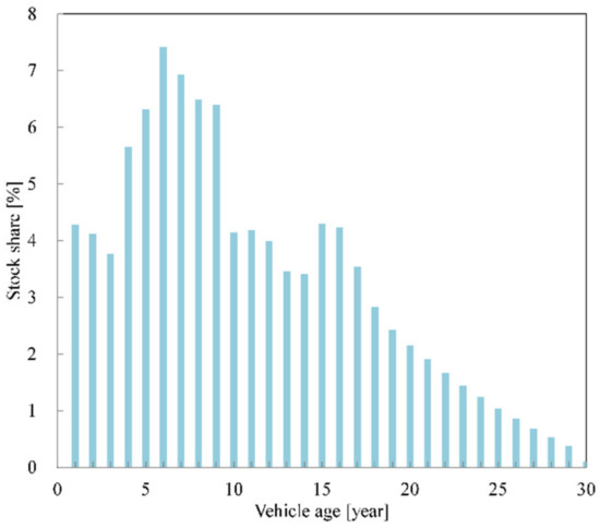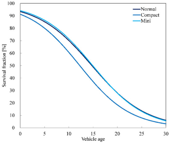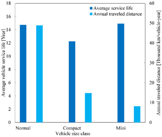 Vehicle usage characteristics are presented in Figure 3 and Figure 4. Annual traveled distance is reported for public and private vehicles for each vehicle size class by MLIT [63]. The shares of public and private vehicles in each vehicle size class were estimated using data from the Automobile Inspection & Registration Association (AIRIA) [64]. These values were used to calculate the annual traveled distance for each vehicle size class as the weighted sum of the annual traveled distances for public and private vehicles. The median vehicle service life for each vehicle size class corresponds to the average value reported by MOE [65]. Similar to Nishimura [66], survival profiles were estimated using the logistic curve shown in Equation (4):