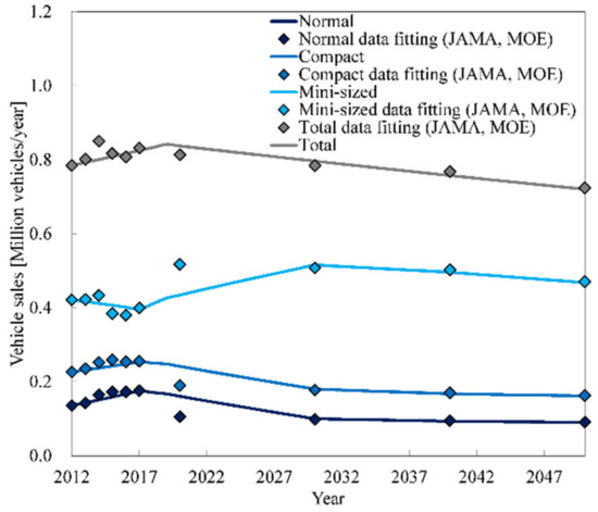 The Base scenario represents the continuation of current trends, with HEVs and ICEVs dominating 2050 new vehicle sales, 38.3% and 55.1%; while BEVs and FCEVs do not achieve significant deployment, each of them accounting for 3.3% of the new vehicle sales [46]. New vehicle sales are shown in Figure 6. The growth trends for the new vehicle sales for each vehicle size class were adjusted using data from the Japan Ministry of Environment (MOE) [65] for future sales forecast, and from the Japanese Automobile Manufacturers Association (JAMA) [70] for historical sales. It was assumed that new vehicle sales do not vary across scenarios.
