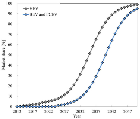 Market shares for EDVs in the alternative scenarios evolve as indicated in Figure 7. These technology diffusion curves were estimated following the methods described in [71]. It was assumed that 2020 is the initial year for HEV diffusion; while 2025 is the initial year for BEV and FCEV diffusion. EDV diffusion was considered symmetrical, with a technology diffusion span of 30 years [72].