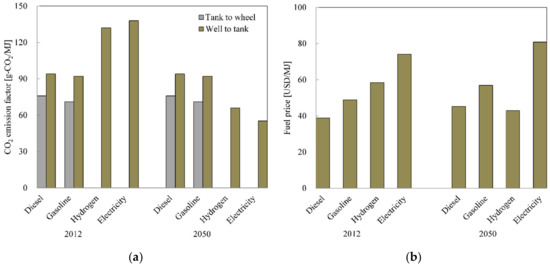 Electricity WTW CO2 emission factor in 2012 was the value reported by the IEA for the electricity generation mix in Japan [78]. Electricity WTW CO2 emission factor in 2050 corresponds to the value of the Nuclear Phase Out scenario from [79], which assumes electricity generation using 50% fossil fuels and 50% renewable energy. Electricity price in 2012 was the historical value reported in [76]; while the electricity price in 2050 was estimated based on the generation cost from [79] and network, retail and other costs from [80]. Steam Methane Reforming (SMR) share in hydrogen production was assumed to go from 100% in 2012 to 50% in 2050. The remaining hydrogen in 2050 is produced using 25% wind electrolysis and 25% solar photovoltaic electrolysis. Prices in 2012 and 2050 were estimated based on the share of each hydrogen production technology and the near term and future delivered hydrogen cost for each technology from [81]. WTW CO2 emission factors in 2012 and 2050 were estimated based on the share of each hydrogen production technology and the technology CO2 emission factor from [75]. Fuel prices and CO2 emission factors are presented in Figure 8.