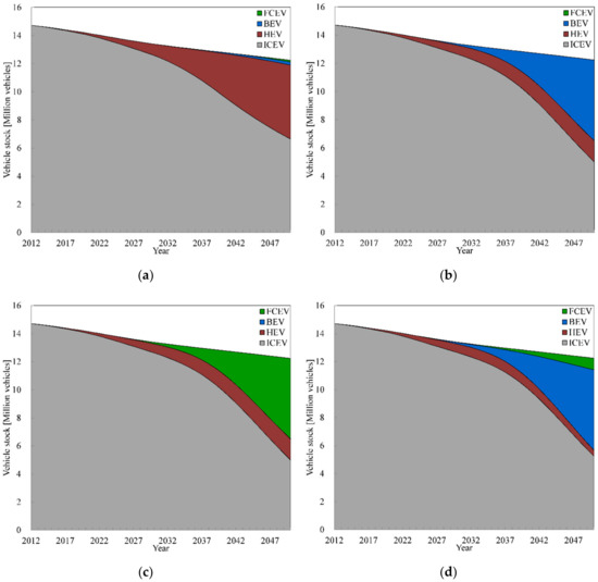 Compared with EDV diffusion in the new vehicle market share presented in Figure 7, diffusion of EDVs in the road freight vehicle stock shown in Figure 9 is slower due to the time lag effect caused by the vehicle service lives; as most of the new vehicles replace current vehicles in use only after their service lives have finished. Long vehicle service lives are a barrier that prevents powertrain electrification in the road freight vehicle fleet. In the case of Japan, vehicle service lives for road freight vehicles are longer than values reported for other countries. For instance, service lives for heavy-duty trucks, medium-duty trucks, light-duty trucks, and mini-trucks in China are 12, 11, 9, and 8 years [82]; while in the United States, values between 7 and 10 years are reported for heavy-duty trucks [31], and 10 years for medium-duty trucks [27]. Even though reducing the vehicle service life for road freight vehicles might seem as a straight forward measure to accelerate penetration of EDVs in the vehicle stock, EDV manufacturing requires more energy and can produce more CO2 emissions than manufacturing ICEVs. Therefore, including vehicle cycle in the assessment of strategies for powertrain electrification in road freight transport is recommended for future research.