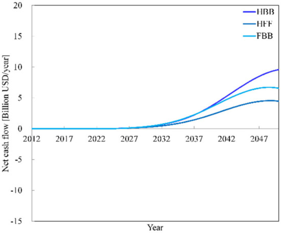 The evaluation of the economic impact of powertrain electrification on the road freight vehicle fleet was performed in terms of the net cash flow; defined as the difference between the road freight vehicle fleet RCO for a given scenario and the road freight vehicle fleet RCO for the Base scenario. The net cash flows for the alternative scenarios are presented in Figure 12. Since penetration of EDVs in the new vehicle sales is slow during the early stages of deployment, net cash flows for all alternative scenarios remain close to zero until 2030. Differences become larger thereafter. The HBB scenario has the largest net cash flows, with the peak outside the time horizon and reaching 9.6 billion USD/year by 2050. The second largest net cash flows are obtained for the FBB scenario, peaking at 6.7 billion USD/year in 2049, and reaching 6.6 billion USD/year by 2050. The lowest net cash flows are obtained for the HBB scenario, peaking at 4.6 billion USD/year in 2049, reaching 4.5 billion USD/year by 2050. It can be seen that the largest values for the net cash flow are obtained for scenarios with BEV diffusion. Furthermore, if BEVs were to be deployed in compact and mini-sized vehicles, it is more cost-effective to deploy FCEVs than HEVs in normal vehicles.