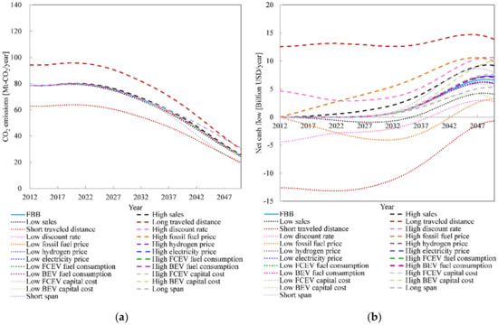 The HBB, HFF and FBB scenarios correspond to alternative scenarios where powertrain electrification is targeted by 2050. These alternative scenarios were built using a ‘silver bullet’ approach, where only one powertrain technology dominates each vehicle size class. Since normal road freight vehicles are usually used to travel the longest distances, corresponding to trips between cities often located in different prefectures, and are the heaviest, using BEV in this vehicle size class would require large batteries to complete each trip without stopping, or more frequent stops for battery charging; both of which increase the cost. Therefore, only HEVs or FCEVs were considered as candidates for powertrain electrification in normal vehicles. In compact and mini-sized vehicles, used typically for travels within cities that require shorter trips, powertrain electrification using BEVs and FCEVs was assessed. The HBB and HFF scenarios focus on mild decarbonization in normal vehicles using HEVs and deep decarbonization in compact and mini-sized vehicles using BEVs or FCEVs. The FBB scenario focuses on deep decarbonization across all vehicle size classes using FCEVs in normal vehicles and BEVs in compact and mini-sized vehicles.