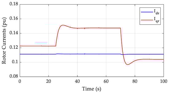 Considering a typical symmetric and balanced three-phase ac power system, the application of Equations (3) and (4) on each phase provides a system of three ac dynamic equations with only the two of them being independent. It should be noted that this assumption is typical for transmission systems, whereas it can be applied to distribution networks of medium/low voltage as well, in which additional assumptions regarding load balancing have to be considered. Nevertheless, since the three-phase ac system contains all variables in sinusoidal form, all these are rarely convenient for analysis purposes. Hence, the system is usually represented by phasors [23] for conventional power systems analysis, usually in steady state, or it is transformed into a two-axis system by adopting the d-q reference frame through Park’s transformation [24], usually for dynamic performance studies. The latter representation displays clear advantages, especially when the synchronously rotating d-q reference frame is adopted since all quantities become time-invariant with all sinusoidal variables to be constant in steady-state [24]. This approach reduces significantly the dynamic model complexity; a fact much desired in large networks and particularly useful in control design and dynamic analysis for both classical and modern power systems.