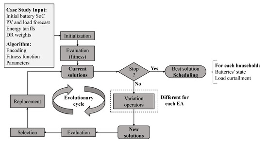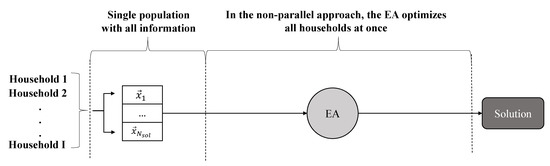 In this paper, given the nature of the mathematical formulation, and the independence of variables between households, we propose two approaches to use the EAs. In the first approach illustrated in Figure 3, so-called non-parallel approach, all variables are combined in a single encoding (explained in Section 3.1). Thus, the EAs use their variation operators over the whole set of variables, until a stop criterion is achieved. This is the typical form in which an EA is applied to solve a given problem.