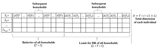 Therefore, the selected encoding should include all the information to validate a solution, and it is very similar to that used in [20], but generalized for I users. Figure 2 shows the structure of a given solution in our framework. The solution first include continues variables representing the charging/discharging state (positive for charging, and negative for discharging) of the users’ battery, at all periods t, for each user i. Therefore, this set includes variables Then, a second set of binary variables is used to indicate a cut action in all load l (‘1’ if load l is curtailed, and ‘0’ if not), at all periods t, for each user i. Therefore, this second set includes binary variables. In general, a complete given solution to the problem is of dimension . The variables are bounded by: