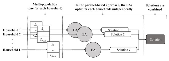 The proposed parallel-based approach breaks the solution into parts corresponding to the variables of each household. After that, each EA optimizes the variables and a post-optimization procedure combines the solutions into a single solution.
