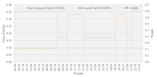It is important to point out, as explained in [20] that the energy bill (first term) and DR curtailment (second term) can be seen as opposite objectives in Equation (1). This is because the curtailment of loads reduces energy bills, but at the same time affects user comfort in different ways depending on user preferences. In this work, however, we decided to select the DR weights of energy cuts following a trend contrary to the buy from grid tariff to promote the use of DR when the price of energy is higher. Other assumptions and targets can be explored in future work.
