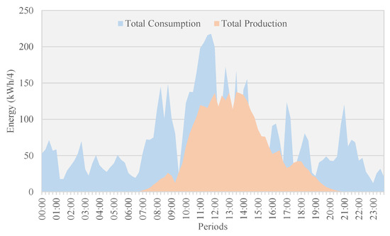 Figure 6 shows the aggregated consumption profiles of 20 households. Notice that the aggregated profile correspond to a typical profile since data from households is generated following base profiles, which in practice might not be the case. However, this paper is focused on the performance of EAs rather than the impact in the diversity of consumers. Further studies can be done considering households with diverse characteristics and their impact in costs and DR curtailment. Figure 7 the total aggregated consumption and generation of 20 households. Finally, input values of variables for each household are summarized in Table 2