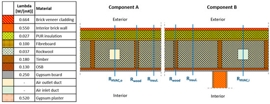 The overall theoretical thermal resistance of non-homogeneous components is theoretically calculated using a volume weighted-average according to the European standard (NBN EN ISO 6946:2007 [23]). Hence, the thermal resistance of the wooden studs and insulation is averaged according to the volume of wood and insulation present in the component. This volume-weighted average thermal resistance, however, can differ significantly from the local thermal resistances. For components A and B, three optional local thermal resistances are indicated: the point where the component is fully insulated (Rinsul.), the point where the wooden structure is situated (Rwood) or the point where a ventilation duct is built into the component (RHVAC).