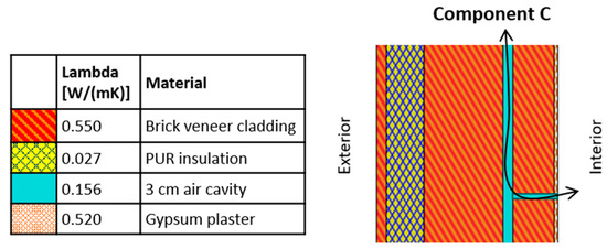 In addition to components A and B, component C will be simulated, which is a vertical section of the post-retrofit, insulated front facade with an air cavity. The presence of this air cavity was confirmed by on-site destructive research. The exact position of the component is indicated in orange as component C in Figure 1 and the vertical section is illustrated in Figure 3. This figure shows a section of the insulated front facade with at the left the exterior insulation layer, finished with a thin layer of brick veneer cladding, and at the right the original cavity wall consisting of two brick slabs. The impact of air flows in the cavity of this front facade component will be assessed by simulations, since previous research [53,54] showed that the thermal resistance of a building component can significantly be affected by this airflow.