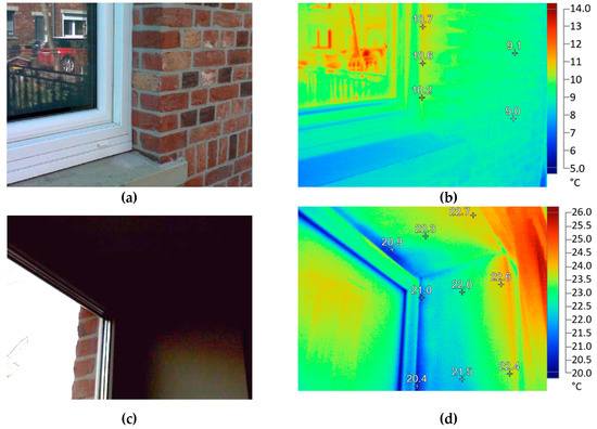 Infrared scan of the building. Top: Air leaks around the window frames connecting the outside and the air cavity—seen from the outside with the building under positive pressure. (a) Exterior photo and (b) Infrared image. Bottom: Air leaks around the window frames connecting the outside and the air cavity – seen from the inside with the building under negative pressure. (c) Interior photo and (d) Infrared image.