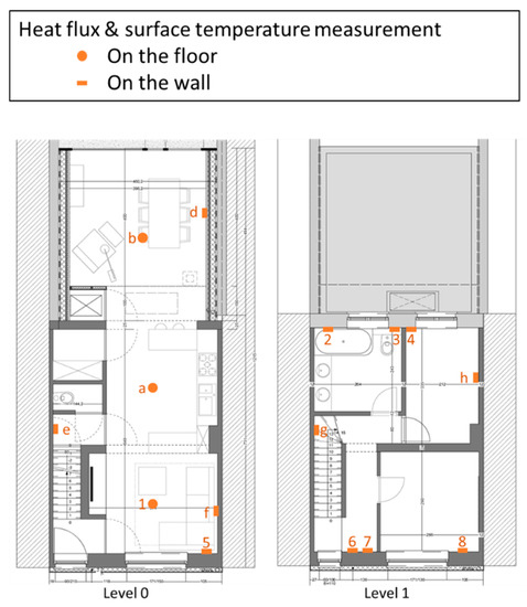 To assess the building envelope performance of the dwelling, co-heating tests [14] and heat flux tests [24] were carried out. Table 3 summarizes the performed tests, their duration, the indoor temperature setpoint Tint,set, the mean outdoor temperature Text,mean and the locations where the heat flux through the building component and accompanying surface temperature were measured, as shown in Figure 5. In this figure, the locations for which the thermal resistance will be identified are numbered, while all other locations are indicated with a letter, representing heat fluxes towards the ground (a and b), towards the cellar (c) and towards the neighboring dwellings (d, e, f, g, and h).
