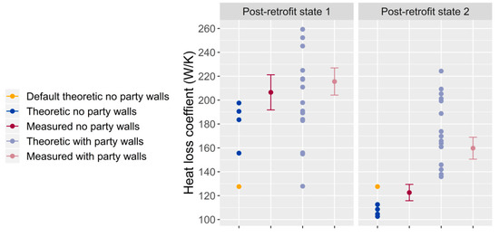 The theoretical value of the HLC is also used in the European standard NBN EN 12831:2003 [26] which presents a methodology to calculate the design heat load of a building. In this generic, some boundary conditions are standardized: a constant infiltration rate is assumed and heat losses towards neighboring dwellings, through the party walls, are neglected. Several researchers, however, showed the importance of taking into account variable infiltration rates [27,28] and heat losses through party walls [29,30,31]. Hence, a standardized HLC might be a rather limited representation of the building envelope performance of a real-life case study, which is why on-site measurements are applied more and more, as seen in [11,13,32,33].