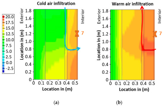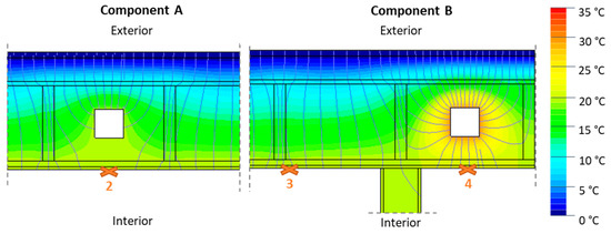 Firstly, two horizontal sections A and B of the post-retrofit, prefabricated rear facade will be simulated with TRISCO [48], the software that was also used to calculate the thermal bridges for the sensitivity analysis of the HLC (Section 3.1.3). Figure 2 illustrates the simulated components A and B, chosen because the heat flux tests were performed here (see Section 3.3. Thereby, the exterior and interior are implemented as simplified surface boundary conditions with a constant global surface heat transfer coefficient of 25 W/(m2K) and 8 W/(m2K) and a constant temperature of 0 °C and 20 °C for the exterior and interior respectively. Moreover, the materials are implemented with a fixed thermal conductivity (lambda W/(mK)), as indicated in the legend of Figure 2. In component A, the built-in ventilation duct is an exhaust duct, while in component B it is a supply duct. These ventilation ducts are modeled as a simplified boundary condition with a convective heat transfer coefficient of 3 W/(m2K) and no radiative transfer coefficient, following the international standard ISO 10077-2 implemented in the TRISCO-software [51,52]. The air temperature of the simplified boundary condition is set equal to the indoor temperature (20 °C) for the exhaust duct, while the air temperature in the supply duct is set at 32 °C, which was measured on-site. Note that the air inlet duct is at a quite high temperature because it is part of the heating system. As an output, the simulation will show the temperature distribution and isoflux-lines, which will be assessed to identify the impact of inhomogeneities in a building component, since wooden studs are alternated with insulation and built-in ventilation ducts.