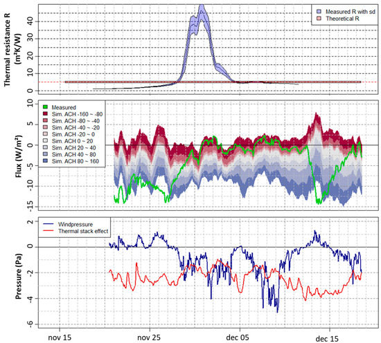 The simulation will be performed with Delphin, a simulation program for the coupled heat, moisture, and matter transport in porous building materials [55]. This software was chosen since Delphin has more advanced dynamic capabilities, e.g., to control air cavity flows and to handle time-dependent boundary conditions [55,56]. In the simulation, the hourly averaged measured interior and exterior temperatures are used as a time-dependent input for component C. The impact of the air cavity ventilation will then be induced by varying the pressure difference between the top and the bottom (as shown in Figure 3). This varying pressure difference yields a variation of the simulated infiltration rate (ACH) of the cavity, of which the values were chosen in accordance with former research [57,58] (−160, −80, −40, −20, 0, 20, 40, 80 and 160 1/h). The output of the simulation is the heat flux, which will be compared to the measured values.