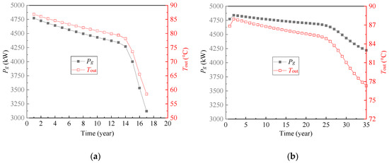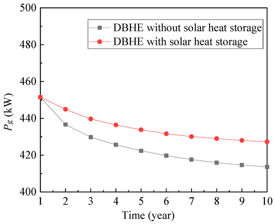 Figure 3c shows the variation of Pg from the beginning to the end of each heating season for both geothermal and solar energy. From Figure 3c there is an attenuation for Pg from the beginning to the end of each heating season, and the attenuation degree becomes bigger with the increase in heating years. For the fifth heating season, the attenuation degree of Pg is 5.27% from the beginning to the end of the heating season, while it is, respectively, 6.79%, 8.08%, 9.20%, 11.11%, 19.89% and 27.43% for the 10th, 15th, 20th, 25th, 30th and 35th heating seasons.