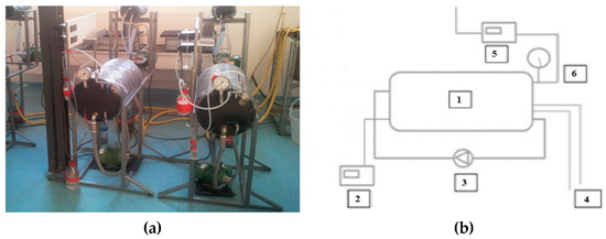 (a) Anaerobic digesters used in the experiment. (b) Diagram of setup of an anaerobic digester (Legend: 1—digester; 2—temperature gauge; 3—pump; 4—inflow and outflow of liquid from the thermostat; 5—gas gauge; 6—manometer).