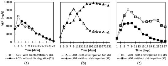 Anaerobic digestion is a microbiological process in which complex organic substances are transformed into biogas. VFA are important intermediate compounds during the anaerobic digestion process, although their increased concentration may inhibit or even completely prevent the anaerobic digestion process. A concentration of VFA in a range from 7000 to 10,500 mg/L is considered inhibiting [22]. Therefore, changes in the indicator in the sludge liquid phase were controlled during the anaerobic digestion process (Figure 2a–c).