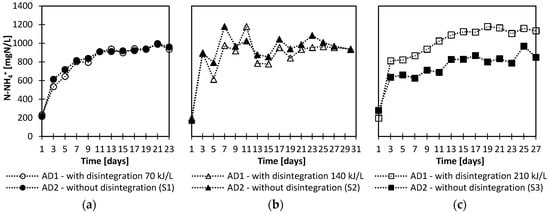 Ammonium nitrogen (N-NH4+) concentration is another indicator the changes of which considerably affect the curse of the anaerobic digestion process. Changes in the N-NH4+ for all the analyzed series are presented in Figure 3a–c. The analysis of the source of points in Figure 3a–c shows that the most intensive (from 2.9- to 5.1-fold) increase in the concentration of N-NH4+ in each of the conducted series was observed between the first and the third day of the anaerobic digestion process. During the period, N-NH4+concentration increased from approximately 200 mg/L to even 892 mg/L. On the subsequent days of the anaerobic digestion process, N-NH4+ concentration gradually increased, adopting maximum values of 997 mg/L (AD2-S1; Figure 3a); 1180 mg/L (AD1 and AD2 -S2; Figure 3b) and 1180 mg/L (AD1-S3; Figure 3c), respectively. According to Appels et al. [22], the concentration of N-NH4+ below 2500 mg/L has no negative effect on the anaerobic digestion process. In all the conducted series, the concentration of N-NH4+ did not exceed 1180 mg/L. Therefore, it can be considered as a factor that does not inhibit the course of the anaerobic digestion process.