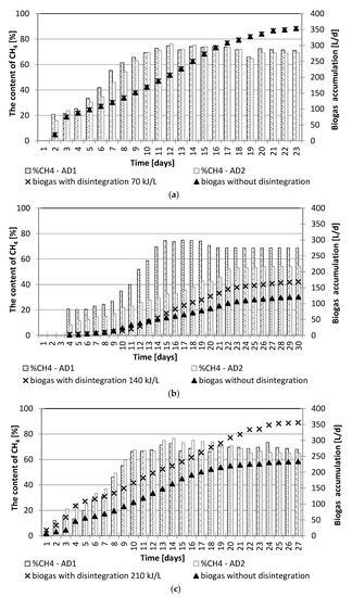 Changes in the curves of biogas accumulation and the percentage of the content of methane in biogas obtained in all the performed series are presented in Figure 4a–c. Figure 4a shows the accumulation of biogas and percentage of methane in biogas obtained in S1. The obtained accumulation was comparable in both digesters (AD1-S1 and AD2-S2), and after 23 days it was approximately 350 L. The percentage of methane content was also at a very similar level, and from the ninth day of the process it stayed in the range from 60% to 80%. No significant increase in methane production could result from too low EL, at which the HC process was carried out.
