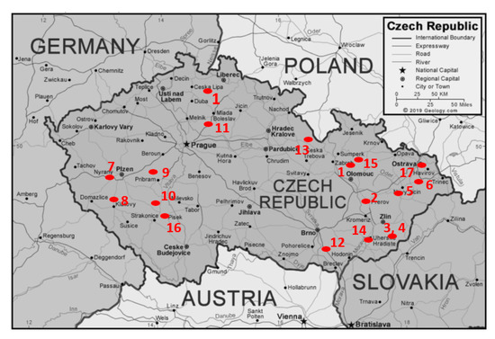 Map with localities of the studied school buildings 1 to 18, (map: https://geology.com/world/czech-republic-satellite-image.shtml).