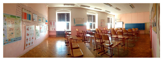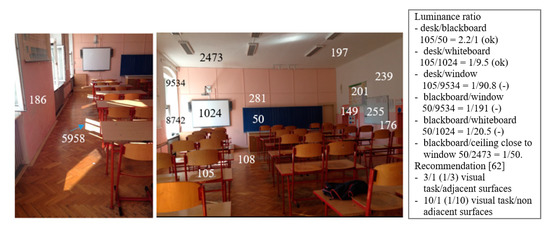Window solar gains also influence indoor visual comfort. Daylight illuminance level was controlled in the classroom (Figure 4). Daylight measurements display that the big southeast-oriented glazed areas inflict uneven daylight distribution (Figure 10, Figure 11 and Figure 12). It is also obvious from increased luminance rates in the classroom visual field (Figure 13). Noticeable variations of interior luminance cause visual discomfort. For example, surfaces in the visual field between the desk and the blackboard. In addition, the positioning of the white glossy board near the window and next to the blackboard is not convenient (Figure 3 and Figure 13). Application of grey boards would be a more reasonable solution in this case.