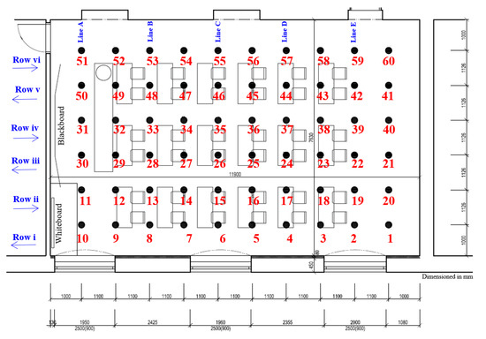 Plan of the classroom with points 1 to 60 on the working plane (0.85 m over the floor).