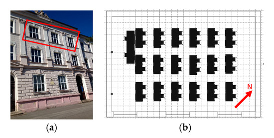 Figure 5. Orientation of windows in the daylight model. (a) Photograph of a part of the school building facade (the classroom windows are on the 2nd floor). (b) Geometric model of the classroom (Daylight Visualizer).