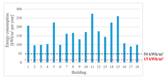 The annual consumption of energy in dependence of the building volume is between 23.7 and 64.7 kWh.m−3 per year and consumption of energy for heating and domestic hot water vary from 19.8 to 61.7 kWh.m−3 per year. The heating energy consumption is quite high in the school buildings compared to demands for low energy buildings (less than 50 kWh/m2 per year) and passive houses (less than 15 kWh/m2 per year) [5] (Figure 6).