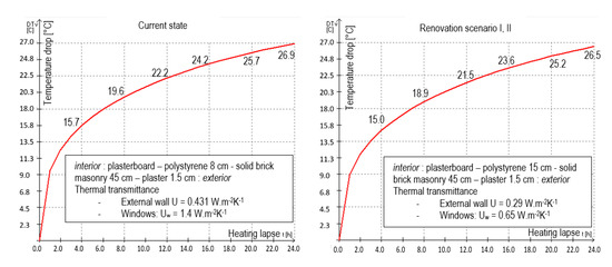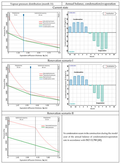Results of the external wall hygro-thermal evaluation are presented in Figure 7. The current wall (U = 0.43 W m−2 K−1) and renovation scenarios (U = 0.29 W m−2 K−1) with internal and external thermal insulation were studied. The figure shows schemes of vapour pressure distribution within the wall and specification of potential condensation regions. An annual balance of condensed/evaporated amount inside of the wall is summarized in graphs. It is clear that the interstitial condensation is fully eliminated in the wall with external thermal insulation (renovation scenario II).