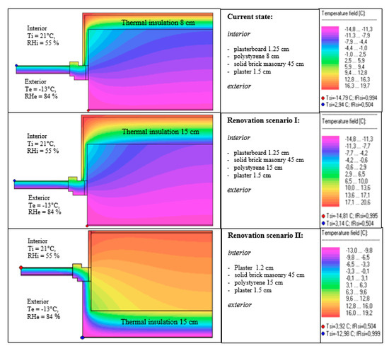 Simulation outputs of two-dimensional temperature distribution of the window jamb details in the current state and in the two renovation scenarios are shown in Figure 8. It is obvious that the variation of the wall with external thermal insulation represents better temperature distribution and more convenient design solution.