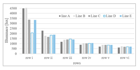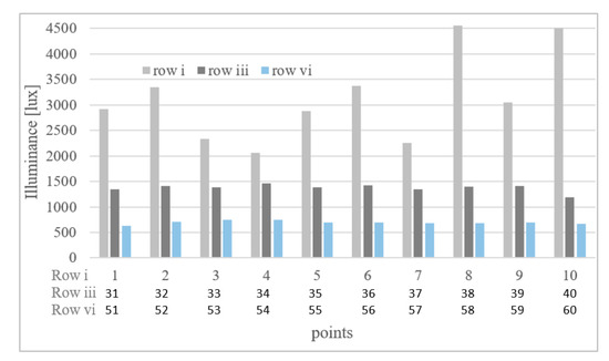 Data from illuminance measurements on the horizontal working plane in the classroom (from Figure 4) are summarized in Figure 10 and Figure 11. The daylight level is reduced with the distance from windows. It is obvious that big differences in illuminance are in Row i close to the window line. The illuminance differences are minimized in the room depth. Higher illuminance values in positions of Line A and B at Row i are influenced due to the glossy whiteboard surface located near the big window (Figure 3). It is also obvious from Figure 11, where illuminance is intensified at points 8, 9 and 10 of Row i. Illuminance at points 2, 6 and 10 is increased because of windows positions. Illuminance difference between window/wall positions is reduced in the room depth—Rows iii to vi.