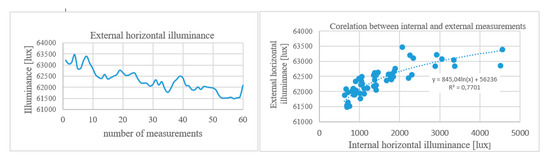 The daylight illuminance was measured using two calibrated illuminance meters Testo 545 (calibration 2017). One illuminance meter was taken for interior measurements and the second device measured external horizontal illuminance. Laser rangefinder Bosch GLM 50 C Professional was used to set points on the working plane. Tripods were also used to stabilize the illuminance meter at the required height. The external illuminance sensor was positioned on the roof. The measuring instruments were synchronized. Outdoor and indoor illuminance values were measured at the same time. The illuminance data processing was carried out in MS Excel and Statistica software [63].