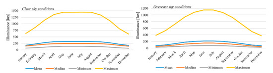 The annual balance of the classroom illuminance on the working plane shows monthly mean, median, minimum and maximum values calculated for 21st day of every month and daytime 12:00 under clear and overcast sky conditions (Figure 14). Illuminance can be increased more than 300 lux in the case of clear sky compared to cloudy sky conditions.