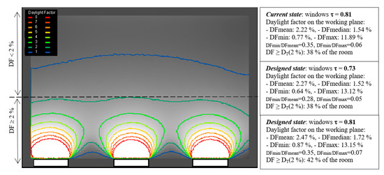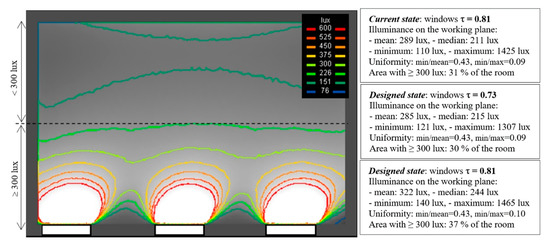 Illuminance [lux] level on the horizontal working plane is shown in colour iso-lines in Figure 15 for the clear sky simulation on 21st June at 12:00. Mean, median, minimum and maximum illuminance and uniformity values in the current and designed state of the classroom (renovated scenario II with two variations of window glazing transmittance) are compared with standard target values [61,62] for desks min 500 lux and desk surroundings min 300 lux. Despite high illuminance levels, a part of the classroom does not comply with target illuminances.